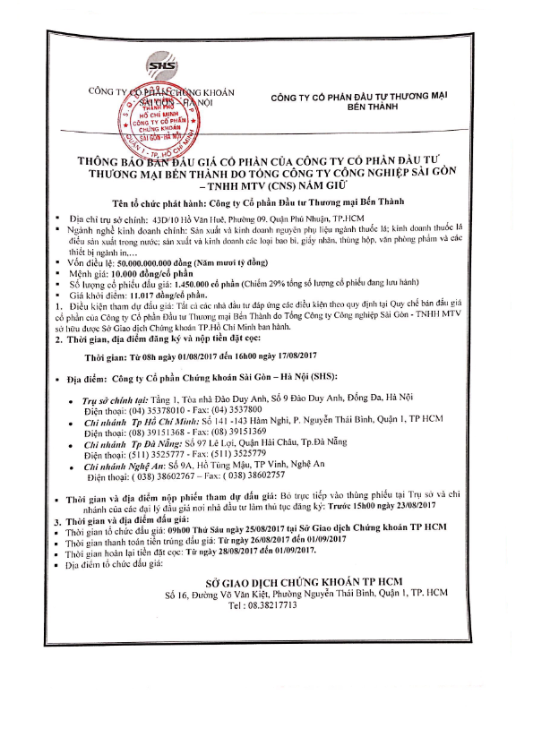 Thông báo bán đấu giá cổ phần của CTCP Đầu tư Thương mại Bến Thành do Tổng Công ty Công Nghiệp Sài Gòn nắm giữ