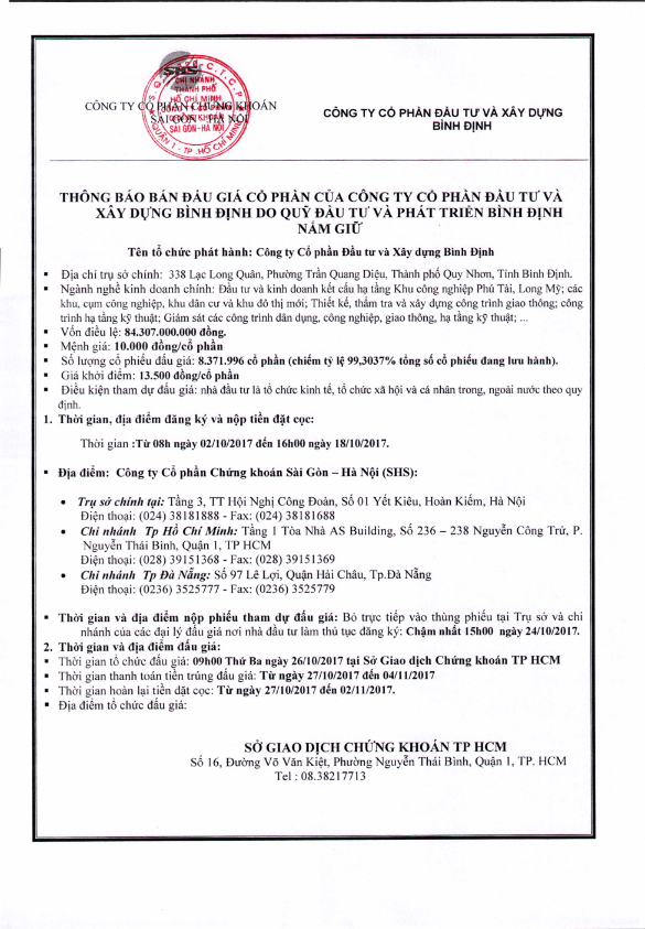Thông báo bán đấu giá cổ phần của CTCP Đầu tư và Xây dựng Bình Định do Qũy Đầu tư và Phát triển Bình Định nắm giữ