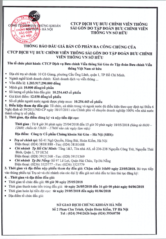 Thông báo bán đấu giá cổ phần của CTCP Dịch vụ Bưu chính Viễn thông Sài Gòn do Tập đoàn Bưu chính Viễn thông Việt Nam sở hữu