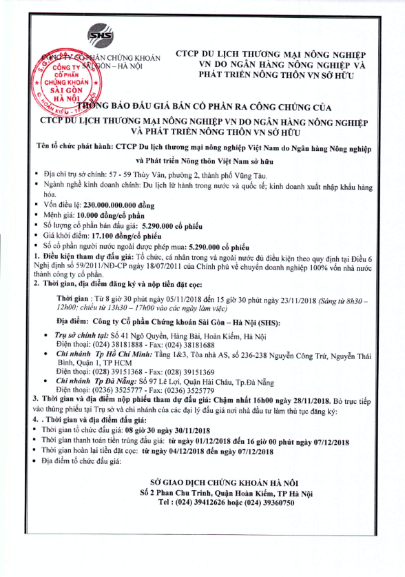 Thông báo bán đấu giá cổ phần của CTCP Du lịch thương mại Nông nghiệp Việt Nam