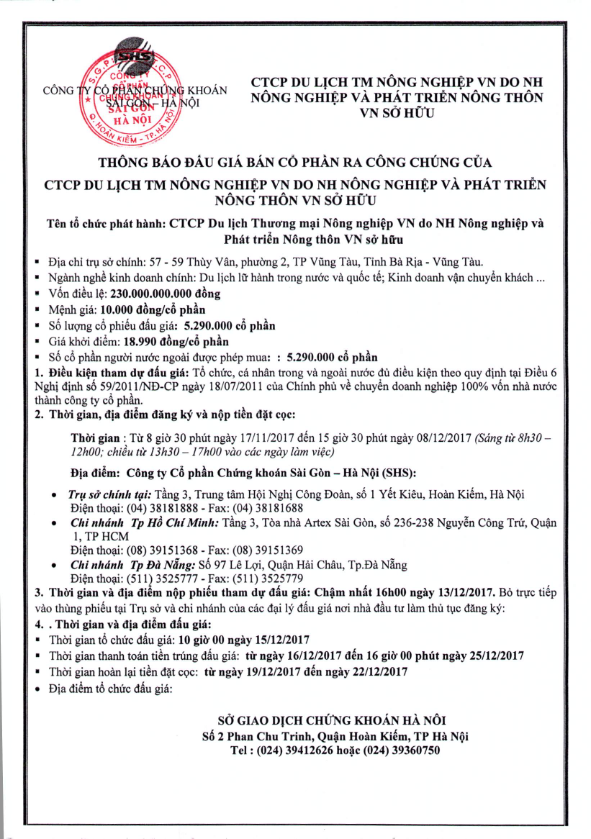 Thông báo bán đấu giá cổ phần của CTCP Du lịch Thương mại Nông nghiệp VN do NH Nông nghiệp và Phát triển Nông thôn VN sở hữu