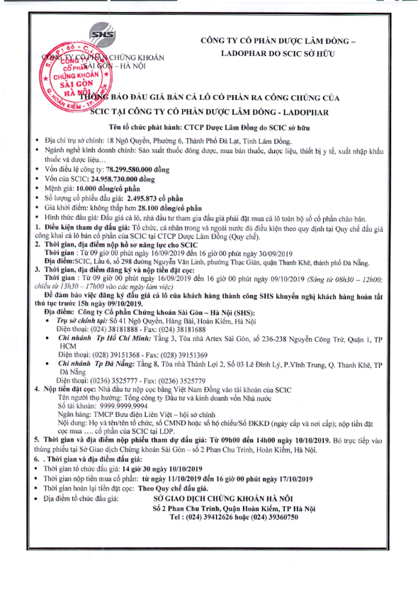 - Thông báo bán đấu giá cổ phần của CTCP Dược Lâm Đồng do SCIC sở hữu - 16/09/2019
