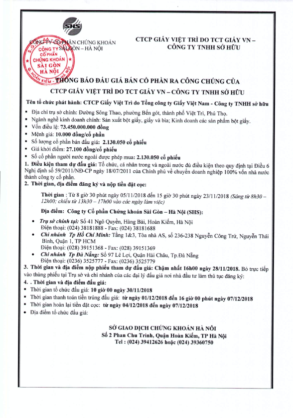 Thông báo bán đấu giá cổ phần của CTCP Giấy Việt Trì Do TCT Giấy VN - Công ty TNHH sở hữu