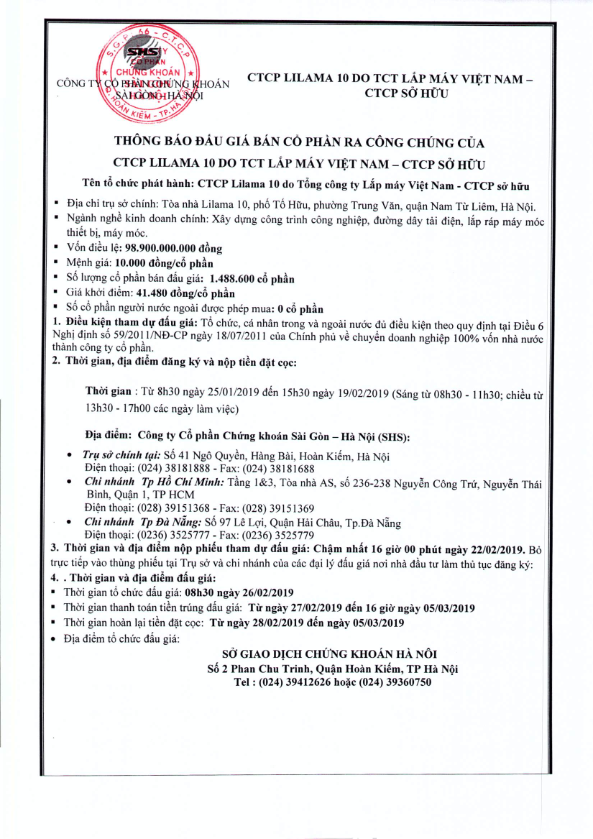 Thông báo bán đấu giá cổ phần của CTCP Lilama 10