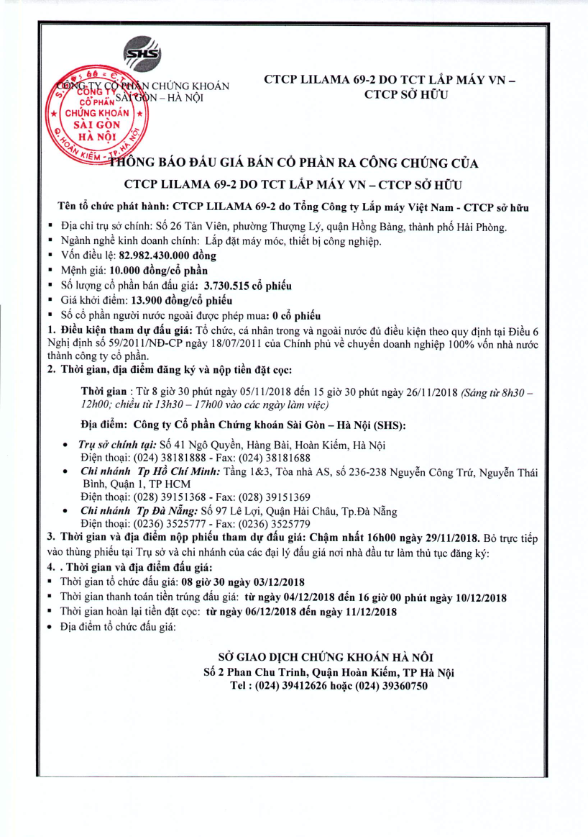 - Thông báo bán đấu giá cổ phần sở hữu của Tổng Công ty Lắp máy Việt Nam – CTCP tại Công ty cổ phần Lilama 69-2 - 02/11/2018