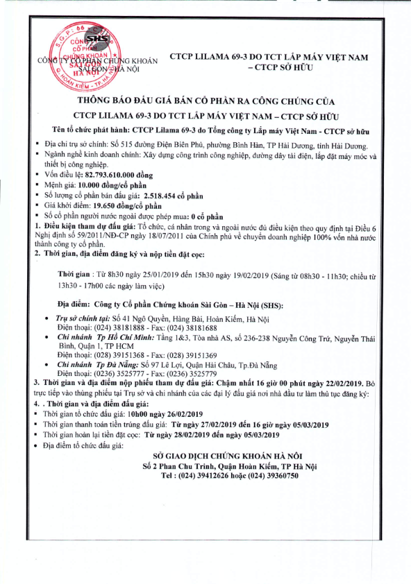 Thông báo bán đấu giá cổ phần của CTCP Lilama 69-3