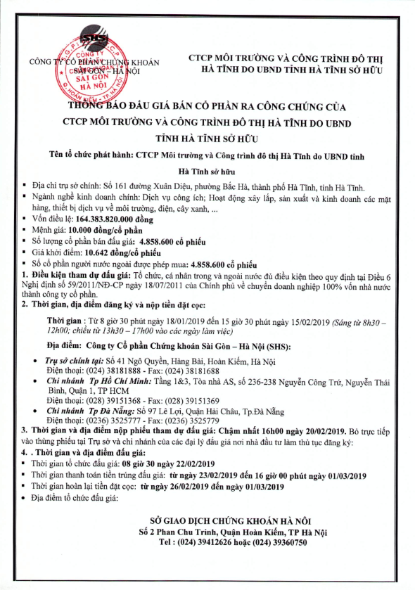 Thông báo bán đấu giá cổ phần của CTCP Môi trường và Công trình đô thị Hà Tĩnh