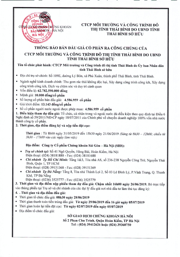 Thông báo bán đấu giá cổ phần của CTCP Môi trường và Công trình Đô thị tỉnh Thái Bình