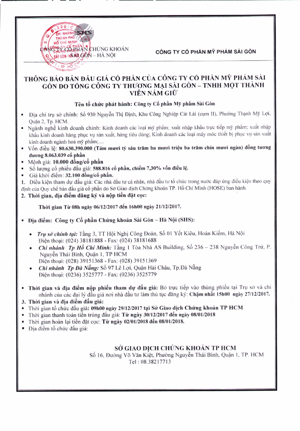 Thông báo bán đấu giá Cổ phần của CTCP Mỹ phẩm Sài Gòn