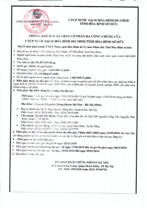 Thông báo bán đấu giá cổ phần của CTCP Nước sạch Hòa Bình do Ủy ban Nhân dân Tỉnh Hòa Bình sở hữu