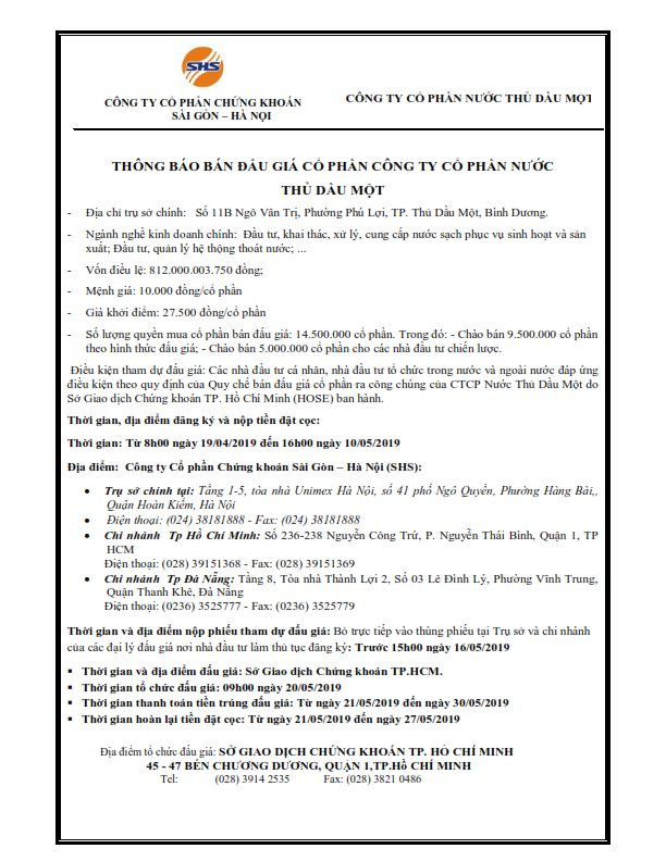 Thông báo bán đấu giá cổ phần của CTCP Nước Thủ Dầu Một
