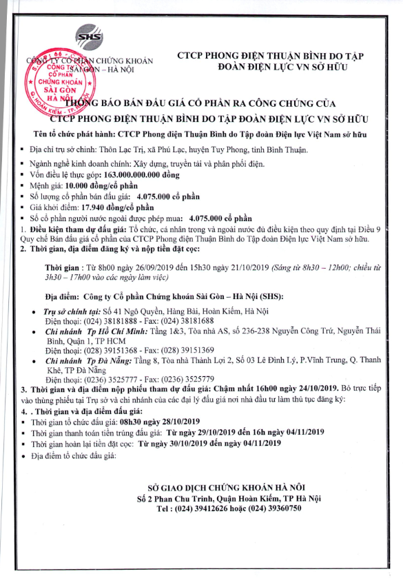 Thông báo bán đấu giá cổ phần của CTCP Phong điện Thuận Bình do EVN sở hữu