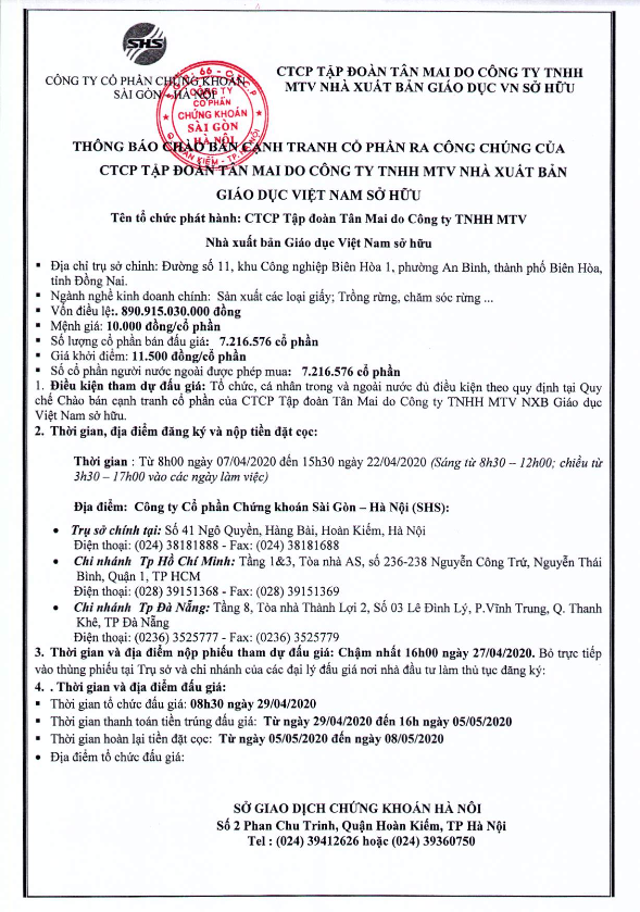 Thông báo bán đấu giá cổ phần của CTCP Tập đoàn Tân Mai do Công ty TNHH MTV Nhà xuất bản Giáo dục Việt Nam sở hữu