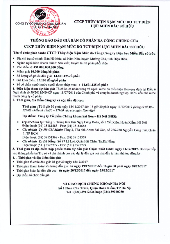 Thông báo bán đấu giá cổ phần của CTCP Thủy điện Nậm Mức do Tổng Công ty Điện lực Miền Bắc sở hữu
