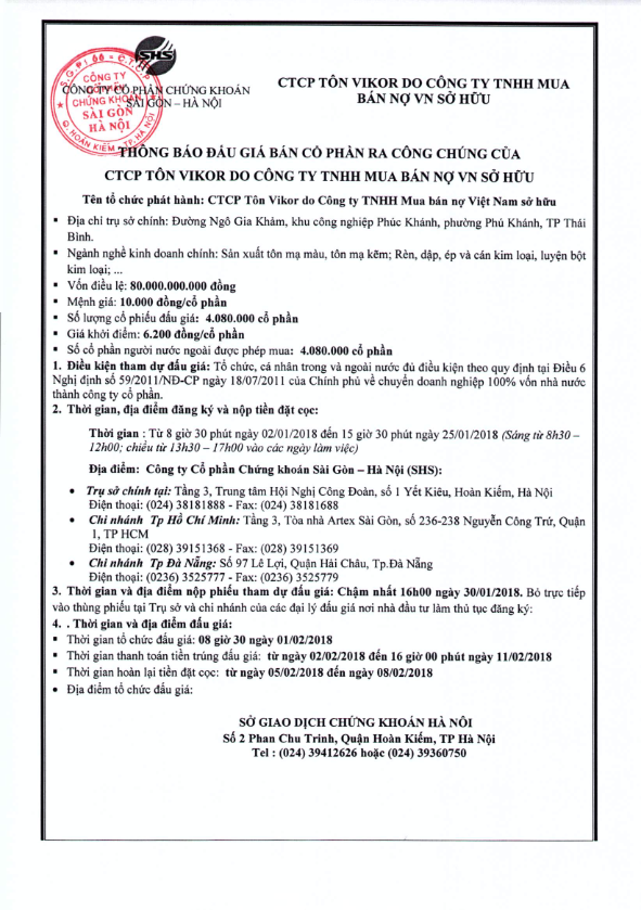Thông báo bán đấu giá cổ phần của CTCP Tôn Vikor