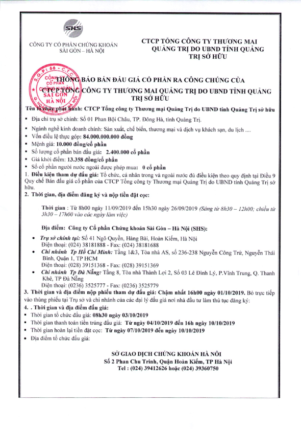 Thông báo bán đấu giá cổ phần của CTCP Tổng công ty Thương mại Quảng Trị