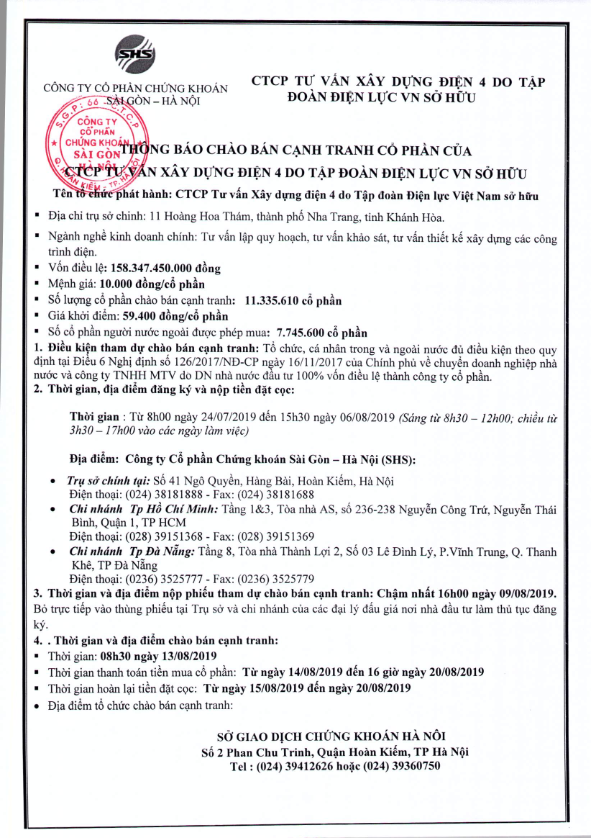 - Thông báo bán đấu giá cổ phần của CTCP Tư vấn Xây dựng điện 4 - 25/07/2019