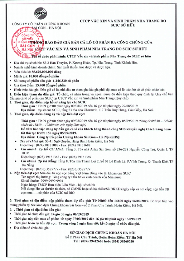 Thông báo bán đấu giá cổ phần của CTCP Vắc xin và Sinh phẩm Nha Trang