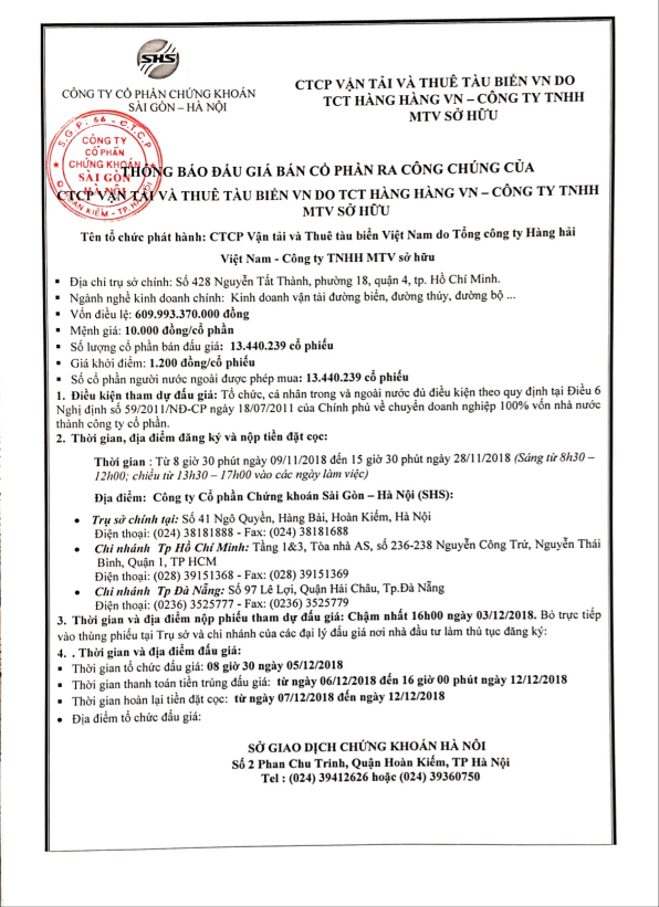 Thông báo bán đấu giá cổ phần của CTCP Vận tải và Thuê tàu biển Việt Nam