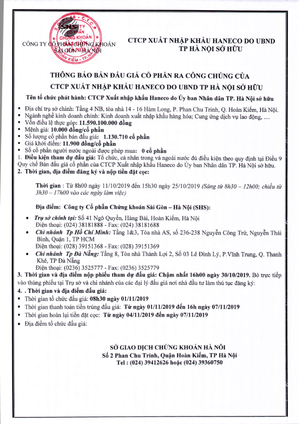 Thông báo bán đấu giá cổ phần của CTCP Xuất nhập khẩu Haneco do UBND TP Hà Nội sở hữu