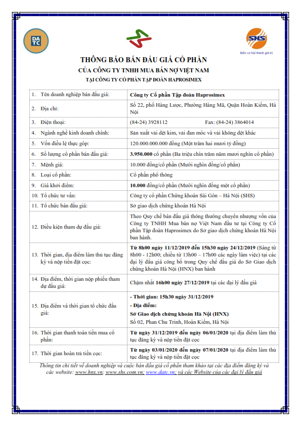 Thông báo bán đấu giá cổ phần của DATC tại CTCP Tập đoàn Haprosimex