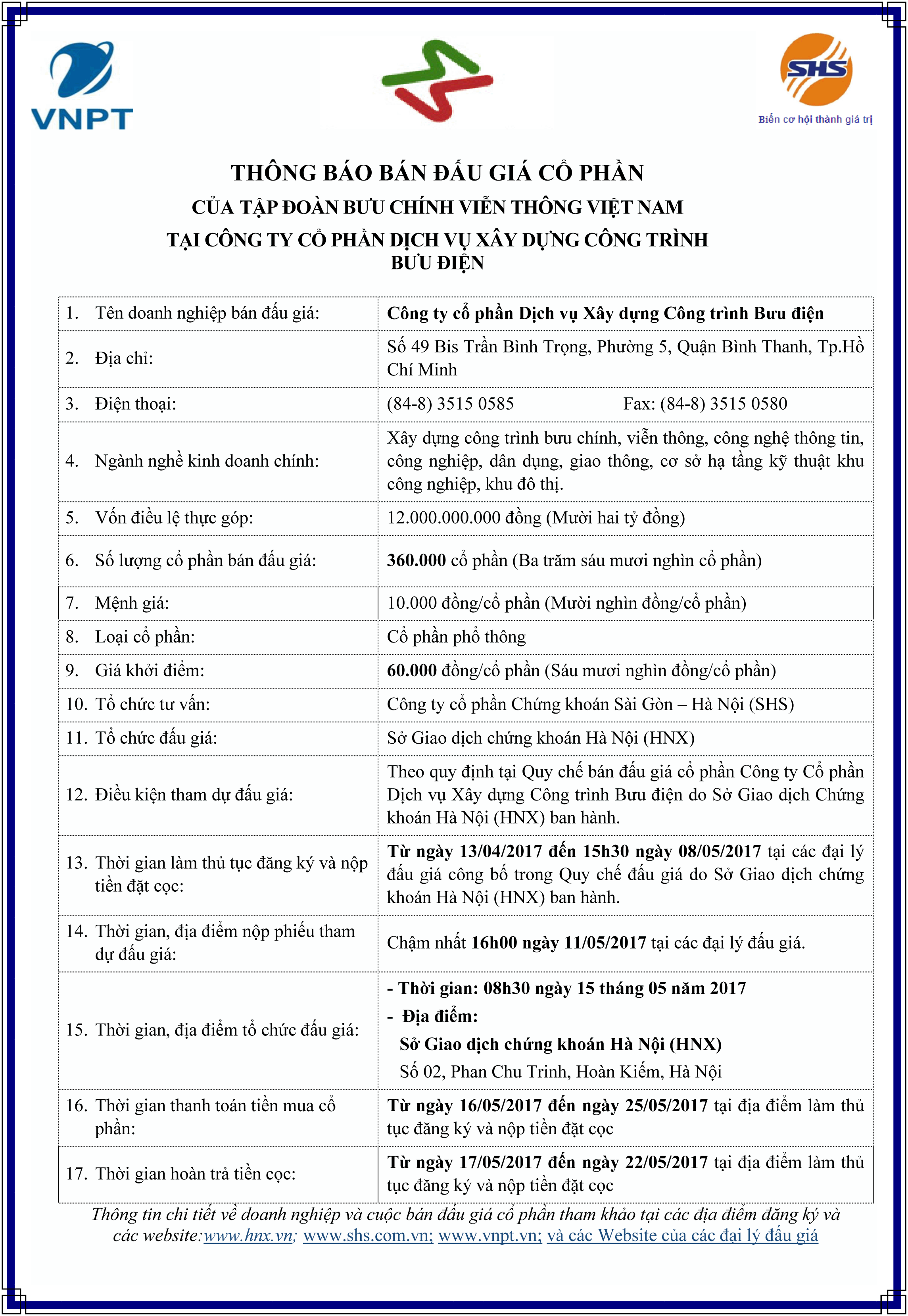 - Thông báo đấu giá CTCP Dịch vụ Xây dựng Công trình Bưu điện do Tập đoàn Bưu chính Viễn thông Việt Nam sở hữu - 14/04/2017