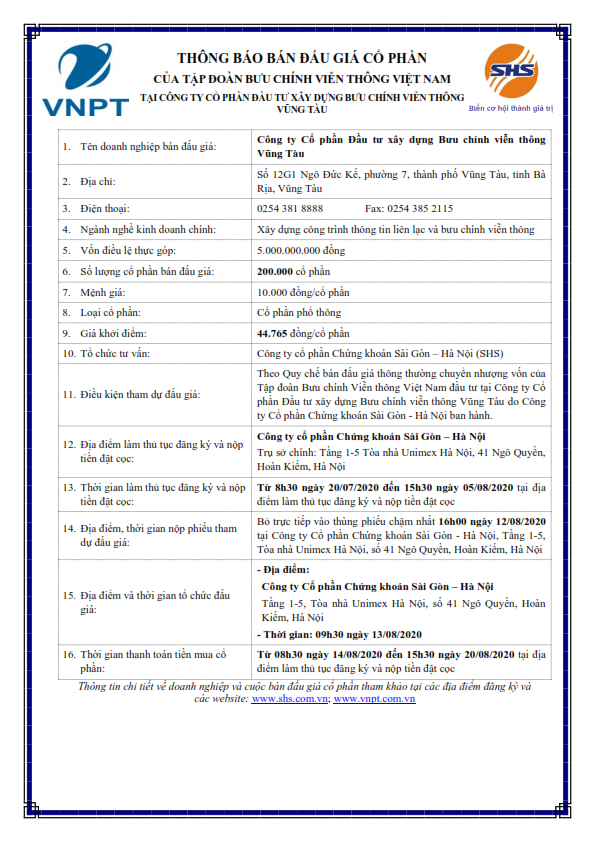 Thông báo bán đấu giá cổ phần của Tập đoàn Bưu chính viễn thông Việt Nam tại CTCP Đầu tư xây dựng Bưu chính viễn thông Vũng Tàu