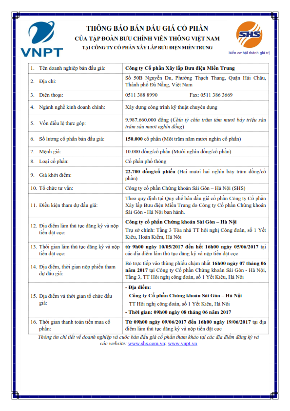 Thông báo bán đấu giá cổ phần của Tập đoàn bưu chính viễn thông Việt Nam tại CTCP Xây lắp bưu điện miền trung
