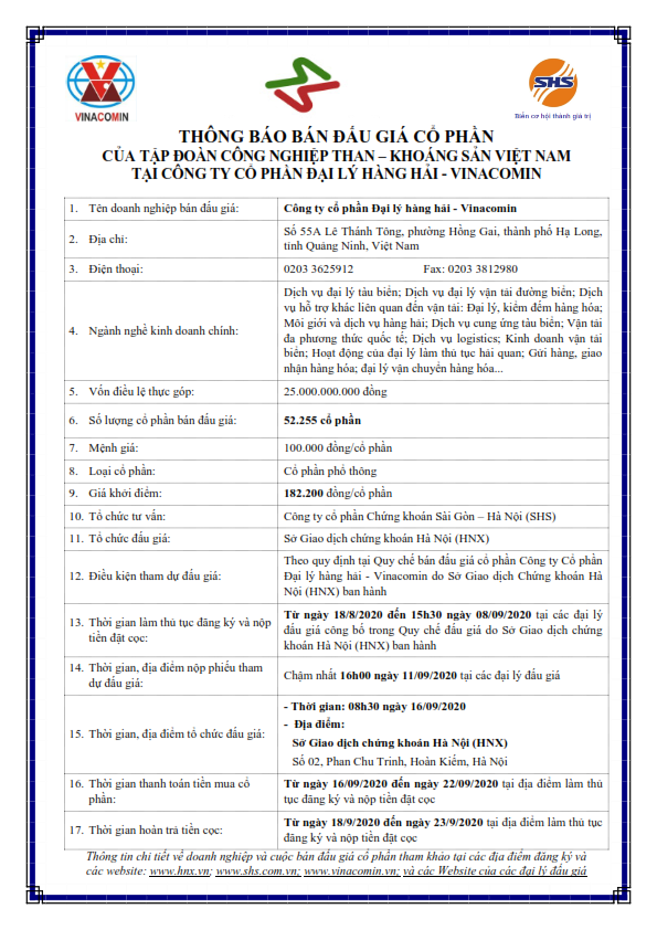 THÔNG BÁO BÁN ĐẤU GIÁ CỔ PHẦN CỦA TẬP ĐOÀN CÔNG NGHIỆP THAN – KHOÁNG SẢN VIỆT NAM TẠI CÔNG TY CỔ PHẦN ĐẠI LÝ HÀNG HẢI - VINACOMIN