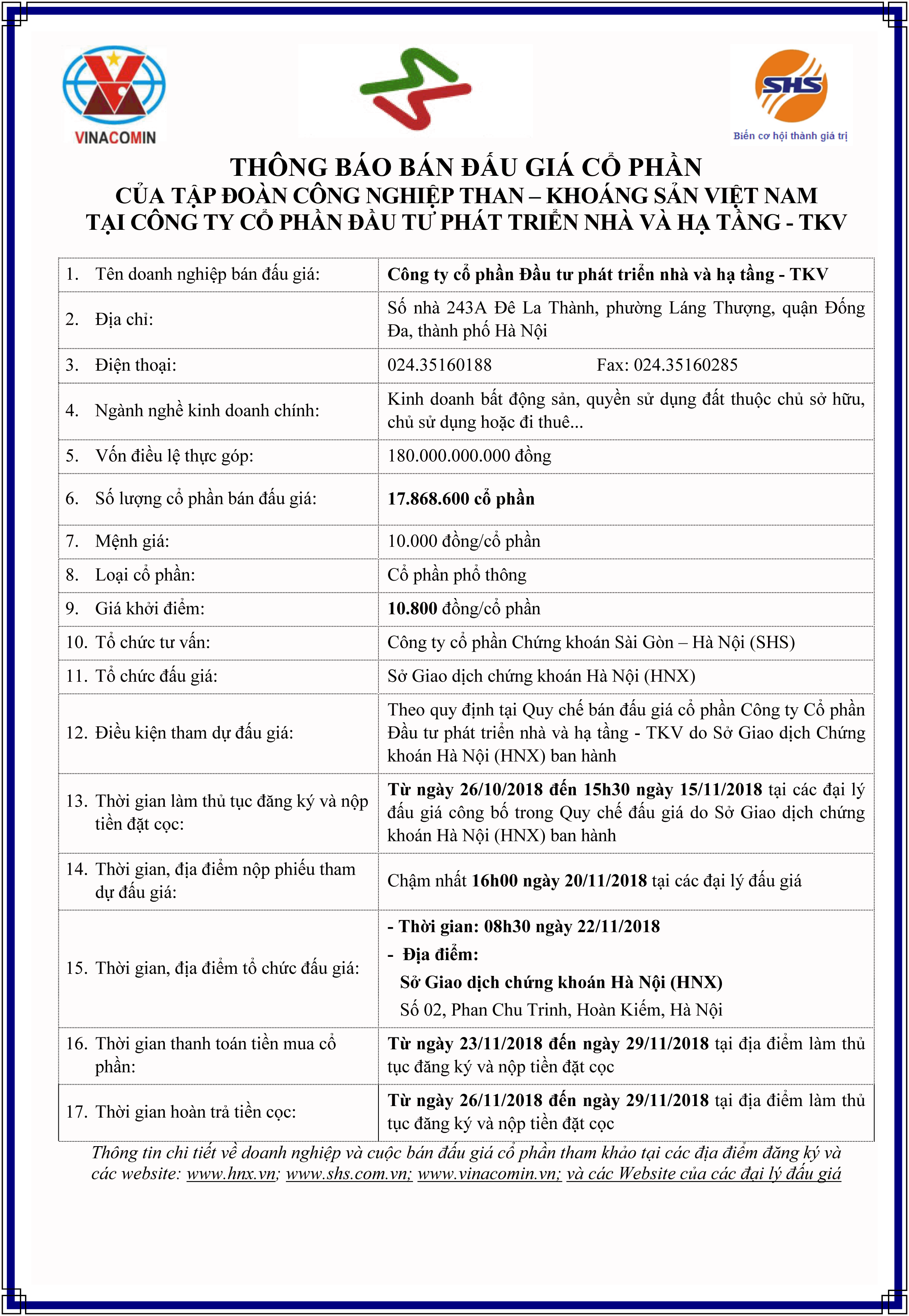 - Thông báo đấu giá bán cổ phần ra công chúng của CTCP Đầu tư phát triển nhà và Hạ tầng - TKV do Tập đoàn CN Than - Khoáng sản Việt Nam sở hữu - 29/10/2018
