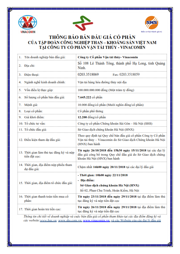 - Thông báo đấu giá bán cổ phần ra công chúng của CTCP Vận tải thủy - Vinacomin do Tập đoàn CN Than - Khoáng sản Việt Nam sở hữu - 29/10/2018