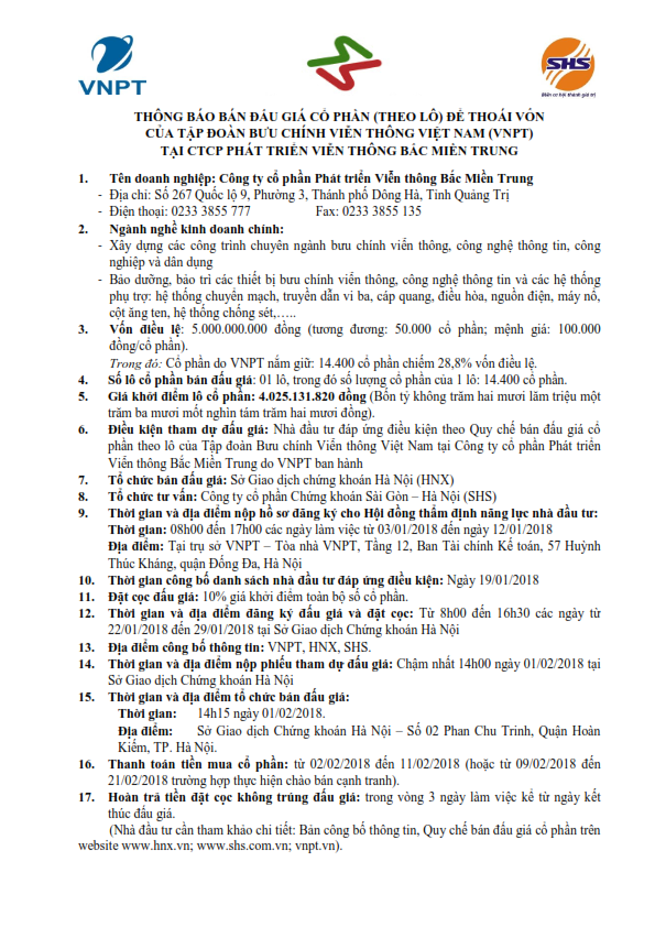Thông báo bán đấu giá cổ phần của Tập đoàn VNPT tại CTCP Phát triển viễn thông Bắc miền trung