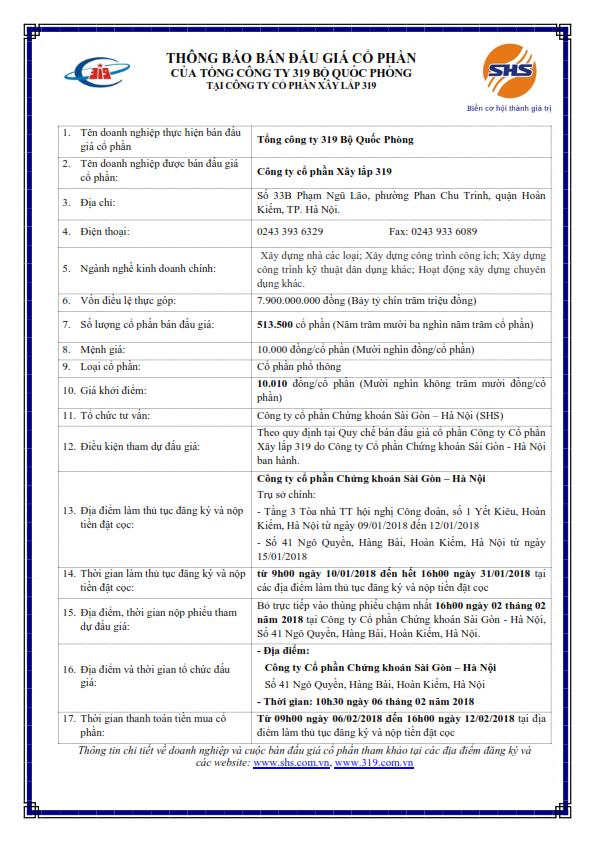- THÔNG BÁO BÁN ĐẤU GIÁ QUYỀN MUA CỔ PHẦN CỦA TỔNG CÔNG TY 319 BỘ QUỐC PHÒNG TẠI CÔNG TY CỔ PHẦN BÊ TÔNG 319 - 10/01/2018