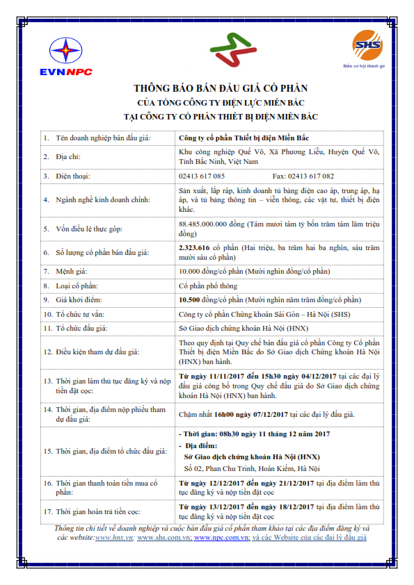 - Thông báo đấu giá bán cổ phần ra công chúng của CTCP Thiết bị Điện miền Bắc do TCT Điện lực miền bắc sở hữu - 13/11/2017