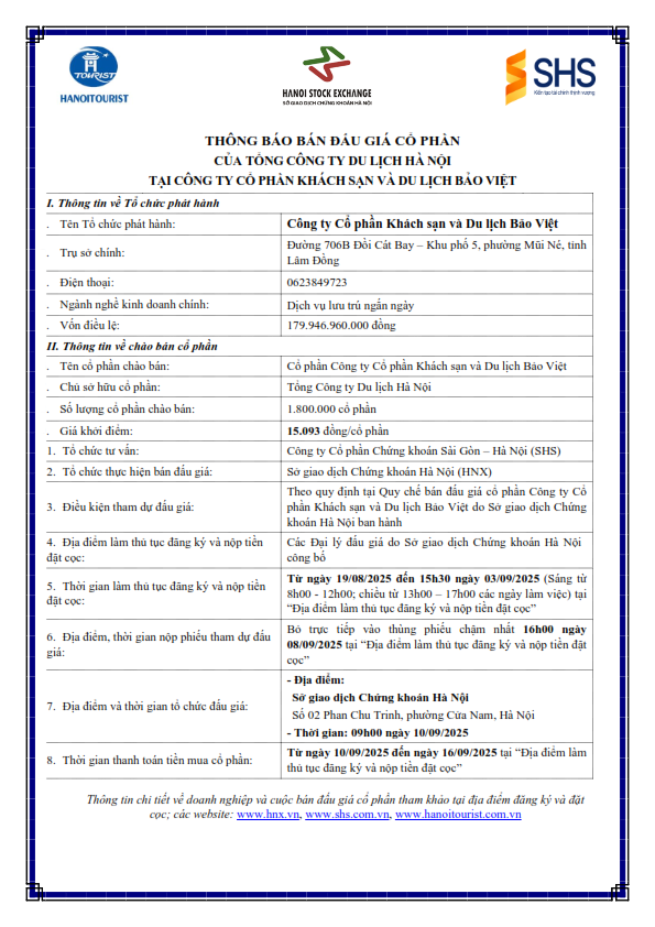 Thông báo bán đấu giá cổ phần của Tổng công ty Du lịch Hà Nội tại CTCP Khách sạn và Du lịch Bảo Việt