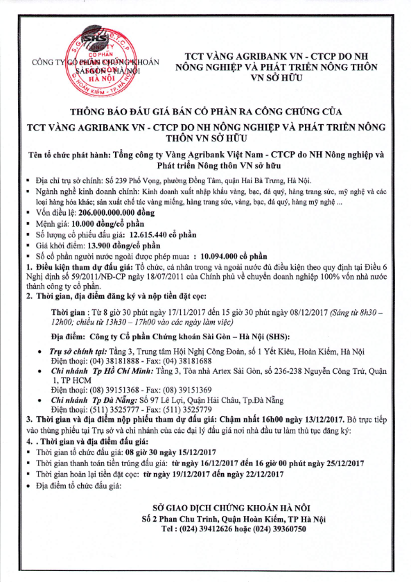 Thông báo bán đấu giá cổ phần của Tổng công ty Vàng Agribank Việt Nam - CTCP do NH Nông nghiệp và Phát triển Nông thôn VN sở hữu