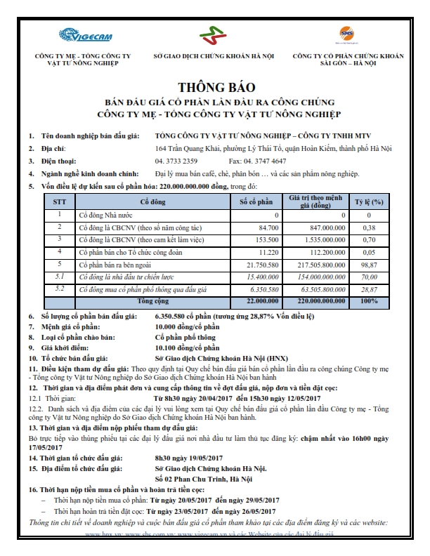 THÔNG BÁO BÁN ĐẤU GIÁ CỔ PHẦN LẦN ĐẦU RA CÔNG CHÚNG CÔNG TY MẸ - TỔNG CÔNG TY VẬT TƯ NÔNG NGHIỆP