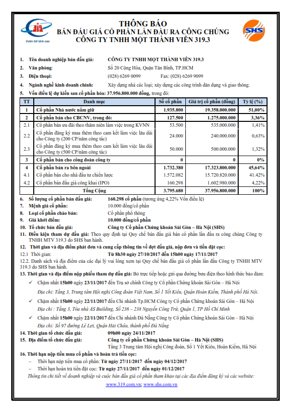 Thông báo bán đấu giá cổ phần lần đầu ra công chúng Công ty TNHH MTV 319.3