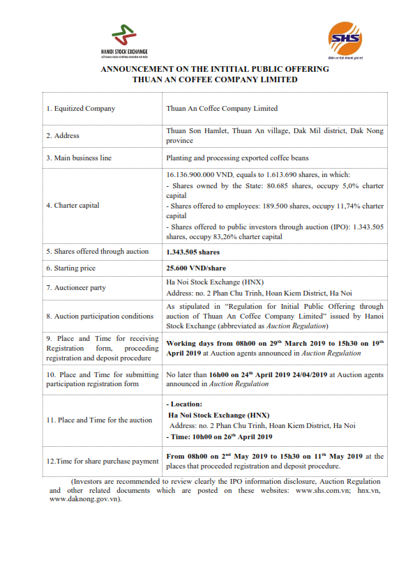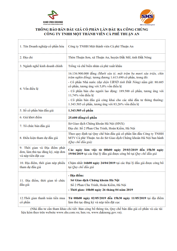 Thông báo bán đấu giá cổ phần lần đầu ra công chúng của CT TNHH MTV Cà Phê Thuận An