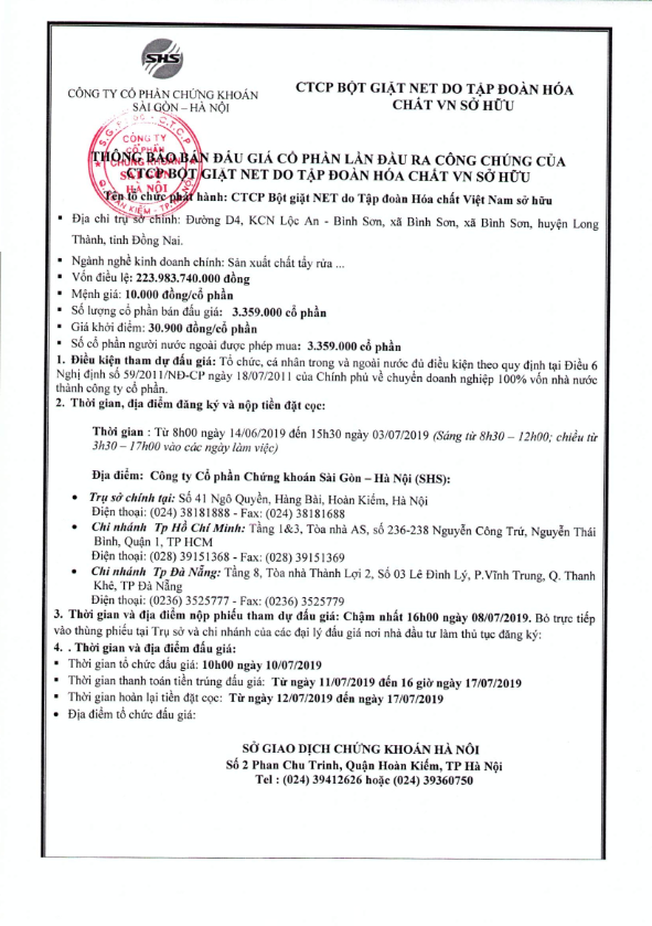 Thông báo bán đấu giá cổ phần lần đầu ra công chúng của CTCP Bột giặt NET do tập đoàn Hòa chất Việt Nam sở hữu