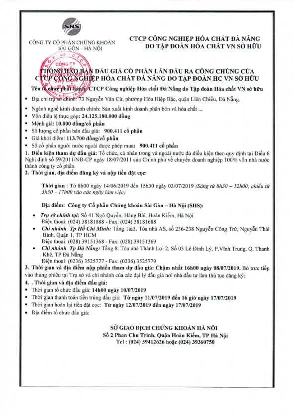 Thông báo bán đấu giá cổ phần lần đầu ra công chúng của CTCP Công nghiệp hóa chất Đà Nẵng