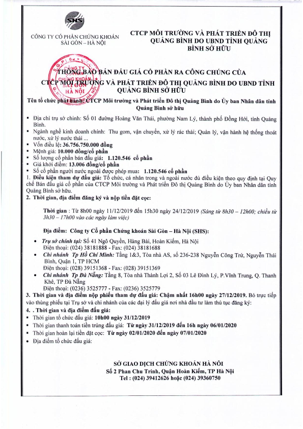 Thông báo bán đấu giá cổ phần lần đầu ra công chúng của CTCP Môi trường và phát triển đô thị Quảng Bình do UBND tỉnh Quảng Bình sở hữu