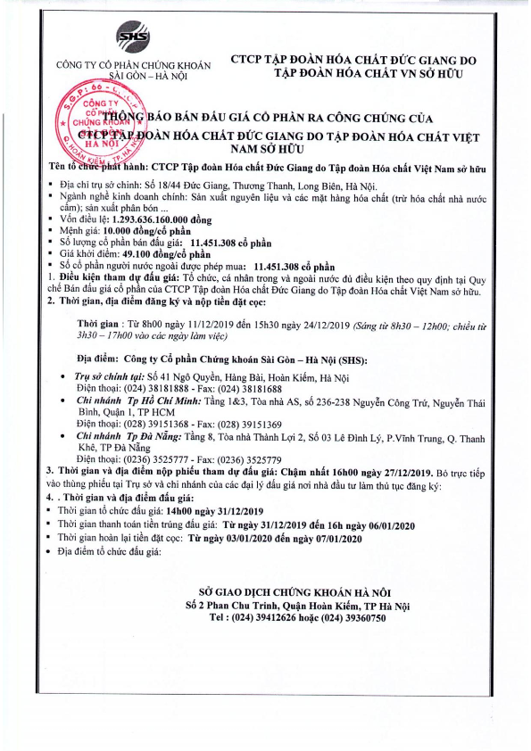 Thông báo bán đấu giá cổ phần lần đầu ra công chúng của CTCP Tập đoàn Hóa chất Đức Giang do tập đoàn hóa chất Việt Nam sở hữu