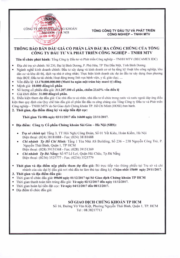 Thông báo bán đấu giá cổ phần lần đầu ra công chúng Tổng Công Ty Đầu tư và Phát triển Công Nghiệp – TNHH MTV