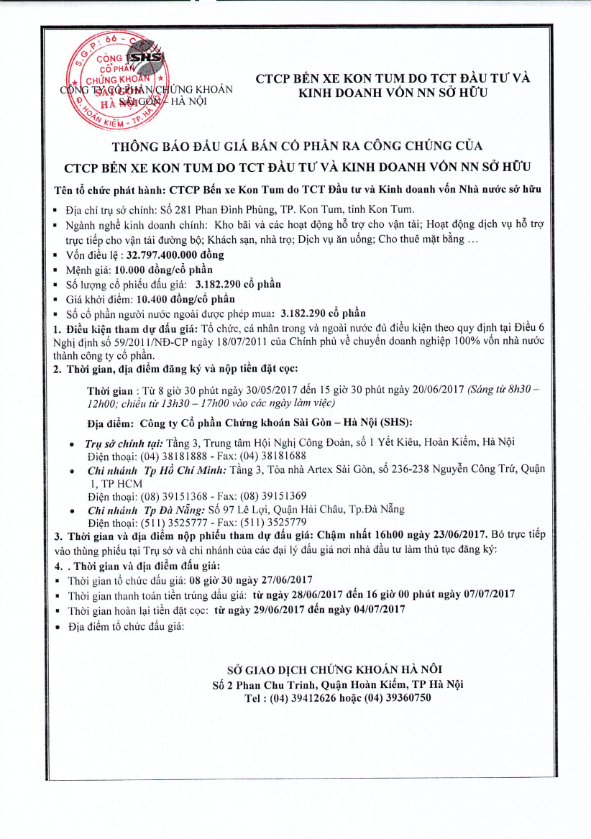 Thông báo bán đấu giá cổ phần ra công chúng của CTCP Bến xe Kon Tum do TCT Đầu tư và kinh doanh Vốn nhà nước sở hữu