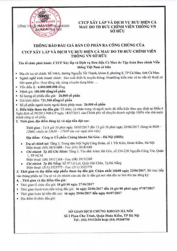 Thông báo bán đấu giá cổ phần ra công chúng của CTCP Xây lắp và dịch vụ bưu điện Cà mau do Tập đoàn Bưu chính viễn thông Việt Nam sở hữu