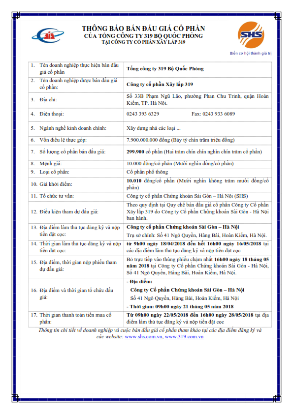 Thông báo bán đấu giá cổ phần tại CTCP Xây lắp 319