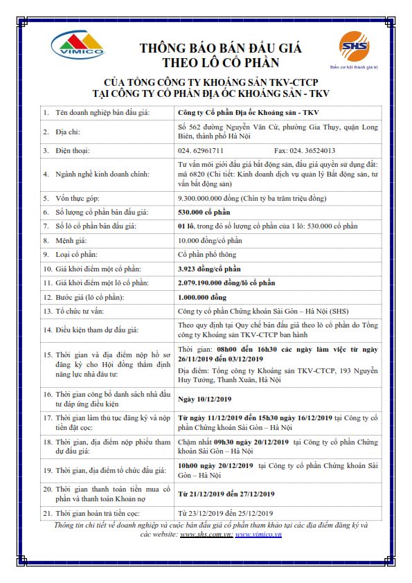 Thông báo bán đấu giá cổ phần theo lô của Tổng công ty Khoáng sản TKV-CTCP tại Công ty Cổ phần Địa ốc Khoáng sản – TKV