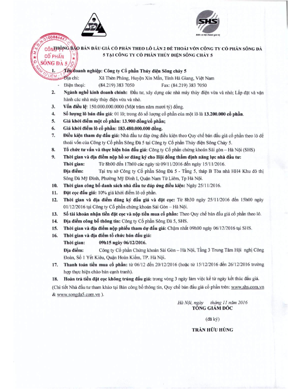 - Thông báo: Nghị quyết về việc dừng thực hiện bán cổ phần của CTCP Sông Đà 5 tại CTCP thủy điện Sông Chảy 5, địa điểm đấu giá tại CTCP Chứng khoán SHS - 23/11/2016