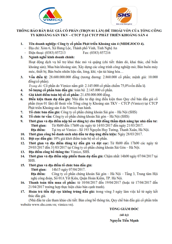 Thông báo bán đấu giá cổ phần (trọn một lần) để thoái vốn của Tổng công ty khoáng sản TKV - CTCP tại CTCP Phát triển khoáng sản 4